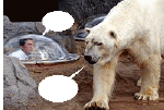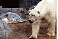 恐らく報道関係者が交代でこのドーム状の "ほっきょくぐま見学スペース"に入り、たまたまこの方が顔を出した瞬間が捉えられてしまったものと思われますが、場に相応しくない無表情さと、お互いに無関心な両者の視線等が相俟って、この記者の「お呼びでなさ加減」が強力に増しています。