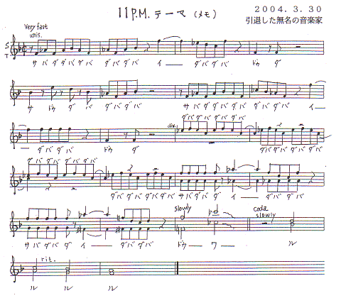 | レコーディングの後はほとんど聴いていませんが、記憶を頼りに譜面にしてみましたので、ご希望があればお送りします。ただし、コードまでは分かりません。 |