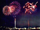 高速道路と電車の灯が描く左右の光の線と、それを縦に貫いて昇って行く花火のコントラストがきれいでした。