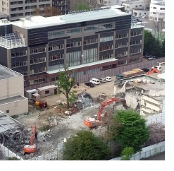 「あー、そのうち古い校舎が解体になってしまうんだなあ」と思っていたのですが、今日の昼、会議から戻って見下ろすと、その解体が始まっています。