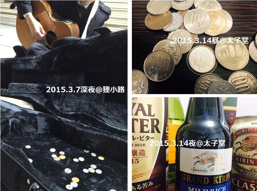 そして、あの日の打ち上げ終了後に狸小路でギターを弾いた時のおひねりを、ギターケースに中に入れたままになっていたことをすっかり忘れ、今日の昼に発見しました。この2千円余りのお金は、わらしべ長者のようにビールとワインに生まれ変わり、いま私は泣きながら(花粉で)、片っ端からこれらを飲んでいます。