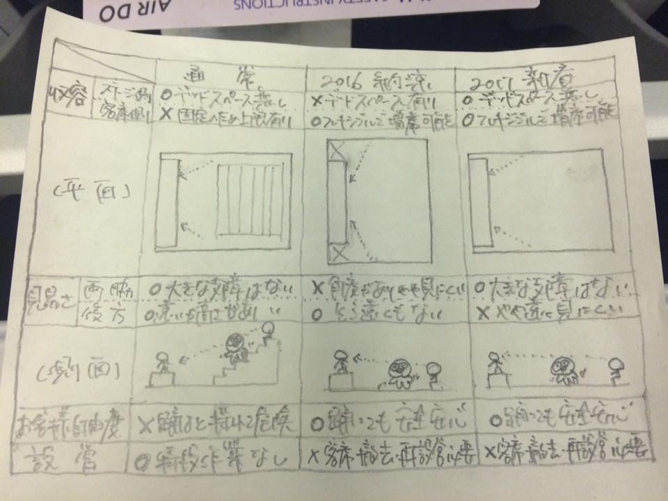 東京出張帰りの機内で複数の対策案を比較検討し、「縦使い&平場客席」によって345席確保を目指すこととしました。