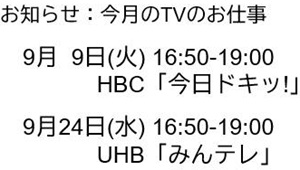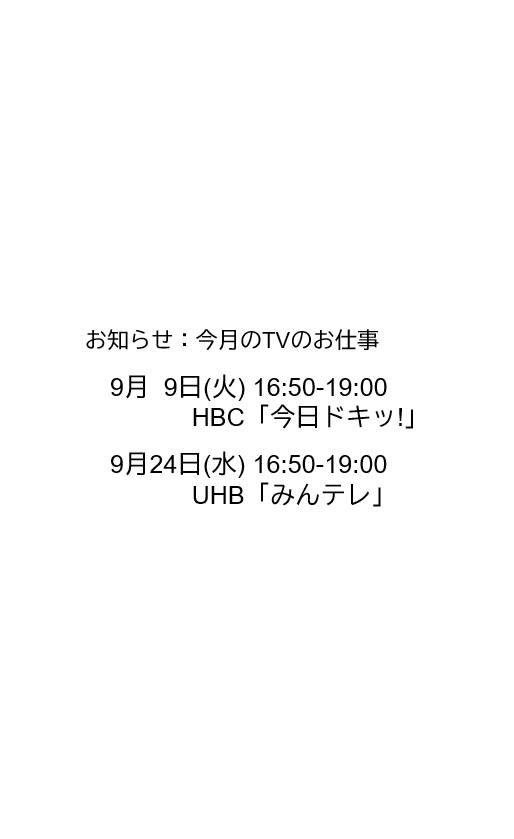 昨年夏に国交省を退職して札幌に戻って以降、テレビ番組のコメンテイターのご依頼を断続的に頂くようになりまして、勿論ガラにもないとお断りし続けていたのですが、色々と大人の事情もありまして本日のUHB(北海道文化放送)「みんテレ」に出演致しました。 当然ながら出演日は何週間も前に決まっていたのですが、「テレビに出るからみんな見てね!」とはとても恥ずかしくて言えず。 ただ「折角なんだから知らせてくれよ」というメッセージも多数頂いてしまい、確かにそうだよなーと(見るか否かは自由なわけで)、反省も致しました。今後はお知らせだけでもするように致します。 その際は温かく見守ってやって下さい。 |